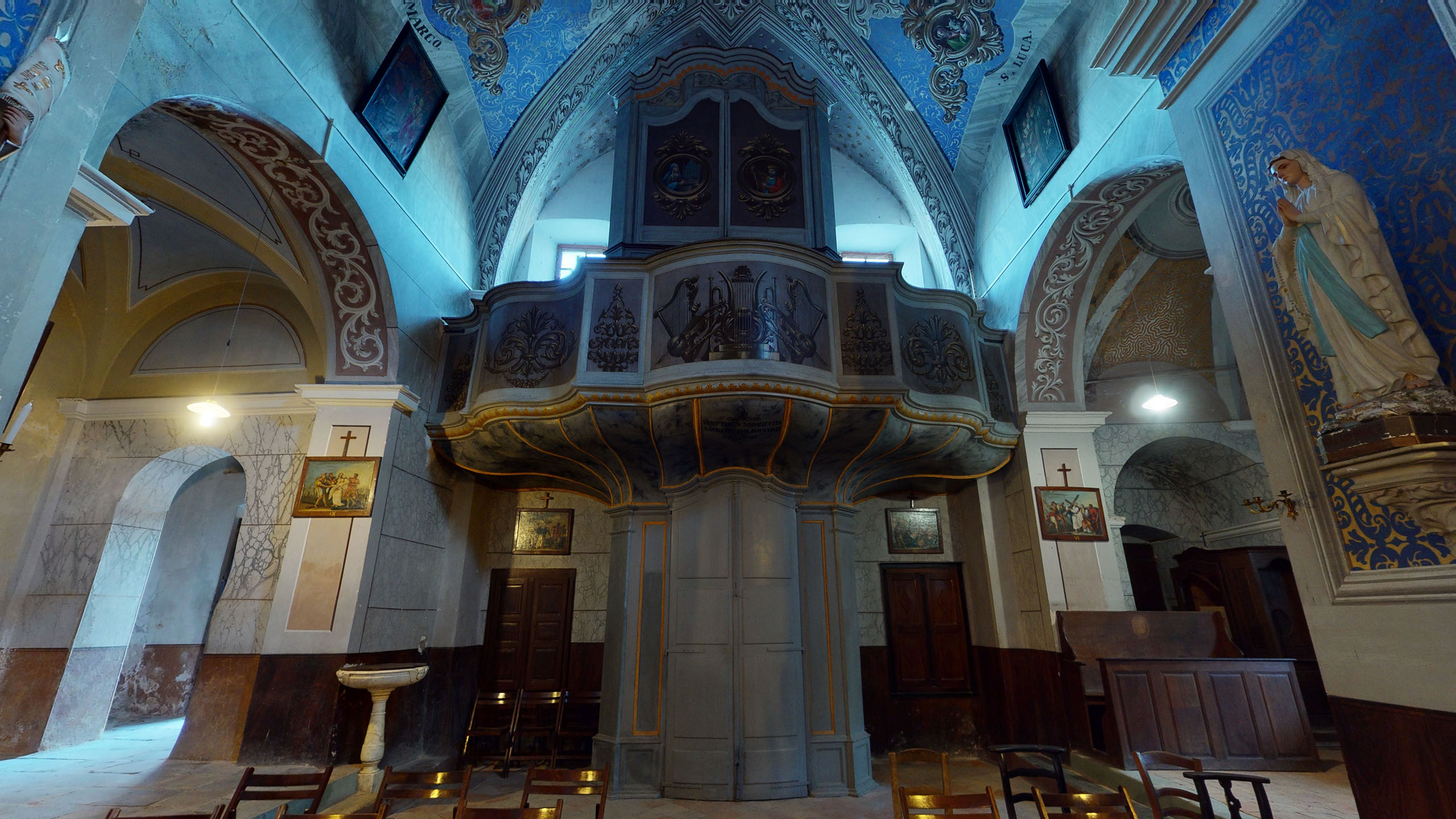 De chaque côté de l’allée, les peintures monumentales de la Nef datant du XIXème siècle, ont été réalisées par le peintre véronais « Pandini » ; elles figurent 6 médaillons, dont 4 représentent les quatre évangélistes St Mathieu, St Jean, St Luc et St Marc et 2, des paysages en trompe l’œil.